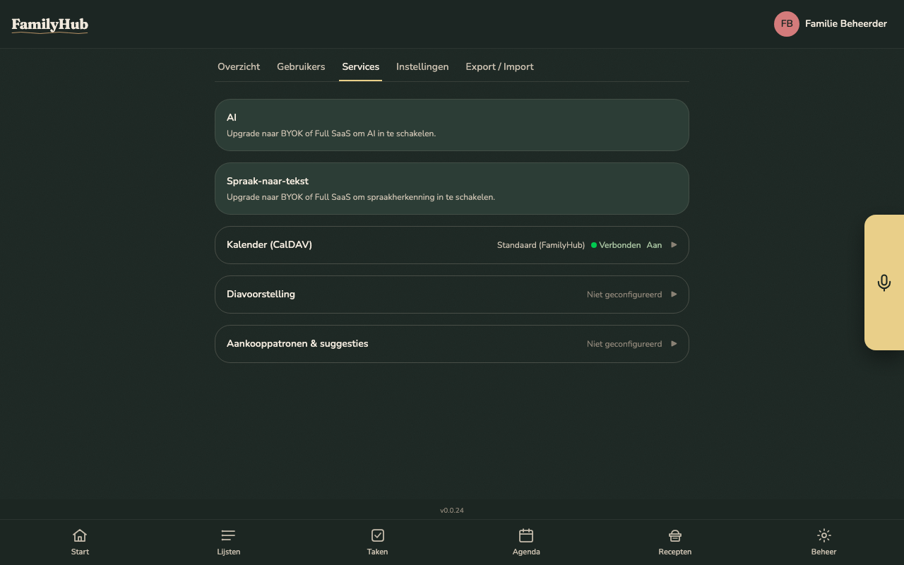 | AI | Voice + text assistant, recipe import, shopping auto-categorise | Provider (Anthropic / OpenAI), API key, optional custom base URL |
