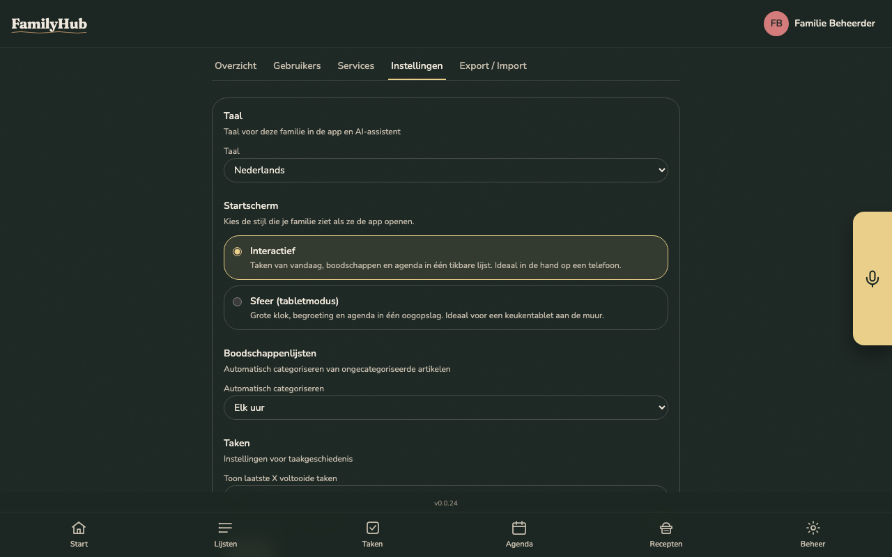 - Shopping auto-categorise interval — how often the background job re-categorises items sitting in Overig; default every hour.