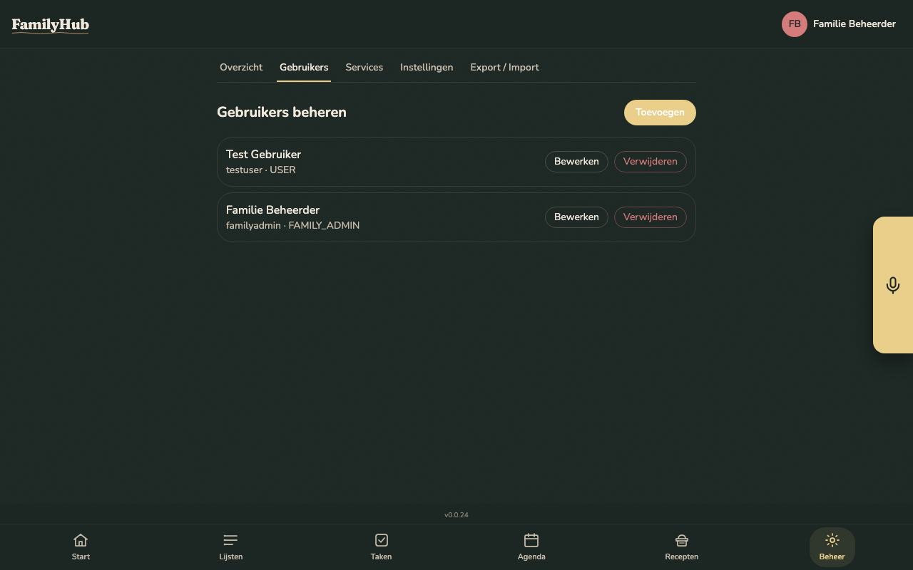 Admin > Users — list, create, update, and delete family members.