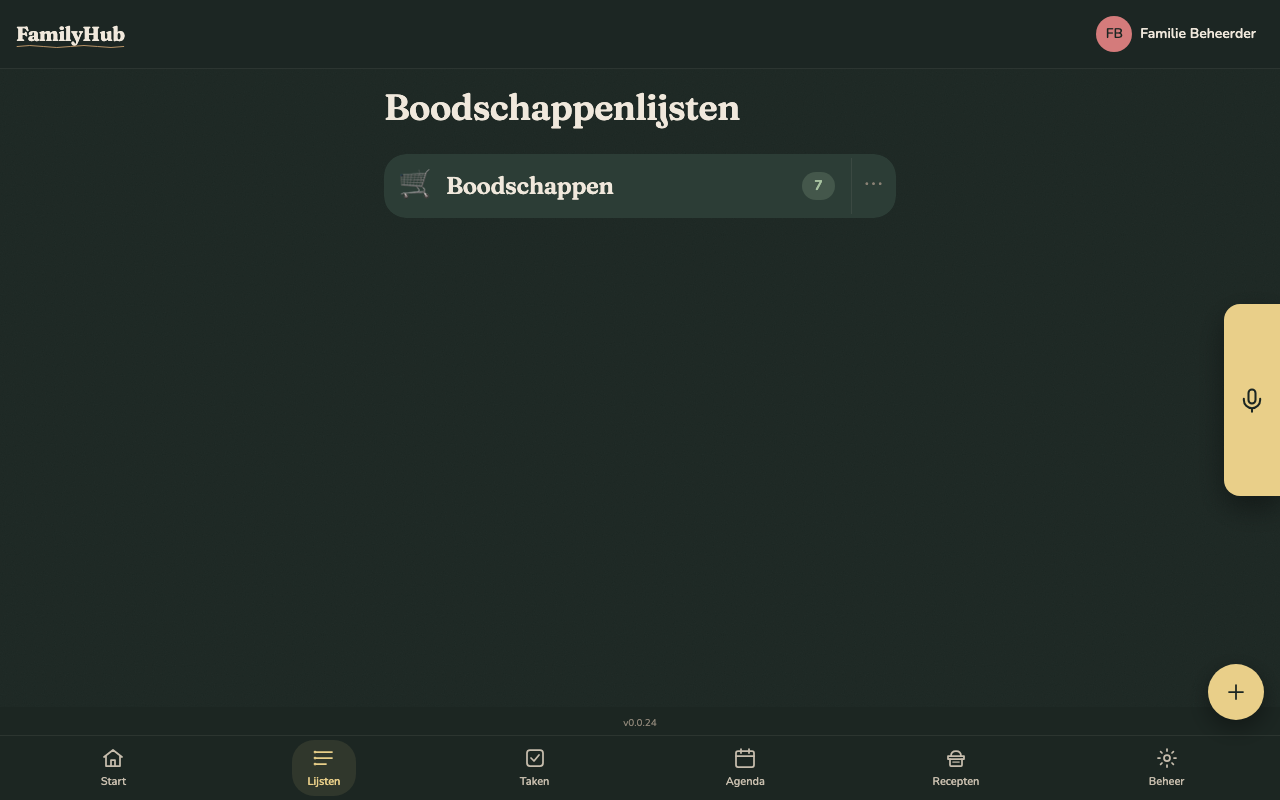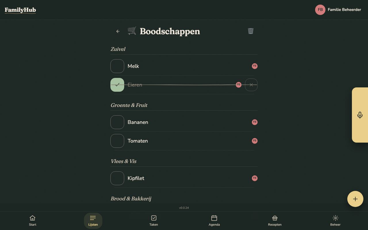 Shopping lists are one of the core modules in FamilyHub. All family members share the same lists in real time — the moment someone adds an item or checks it off, every connected device updates instantly.